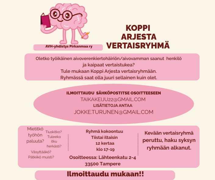 Oletko työikäinen AVH:n tai aivovamman saanut henkilö ja kaipaat vertaistukea? Tämä ryhmä on juuri sinua varten. Koppi arjesta-vertaistukiryhmä aloittaa yhdistyksen omana toimintana 10.2.2026 klo 17…