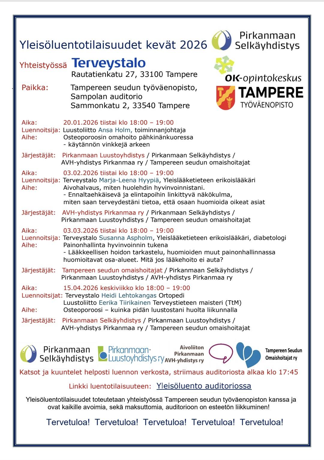 Yleisöluentotilaisuudet ovat kaikille avoimia ja maksuttomia! Auditorioon on esteetön liikkuminen. katselet ja kuuntelet helposti myös verkon kautta Tampereen seudun työväenopiston youtube kanavalta.
