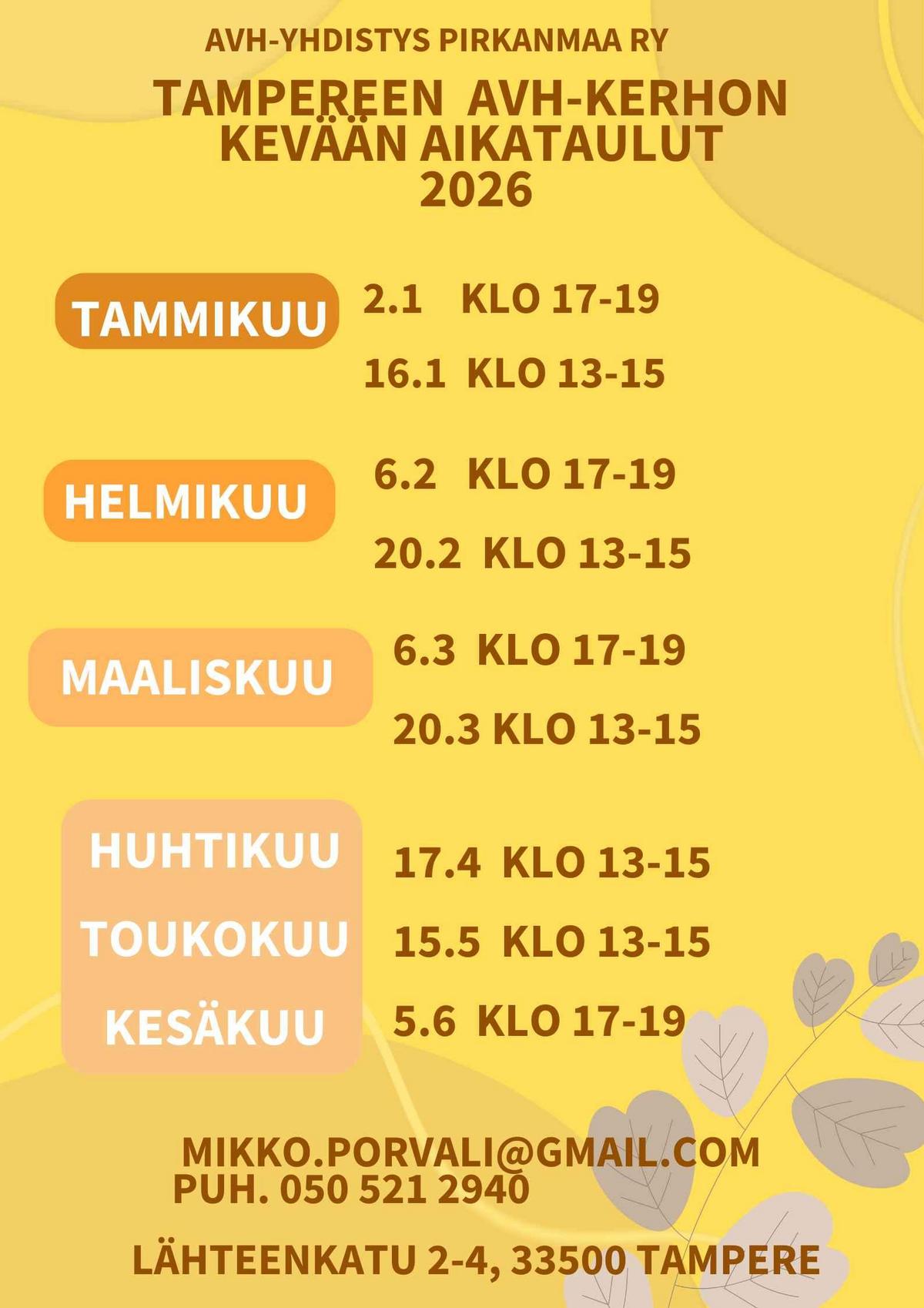 Paikka: Aivoliiton Pirkanmaan AVH-yhdistys, Lähteenkatu 2-4. Tampere