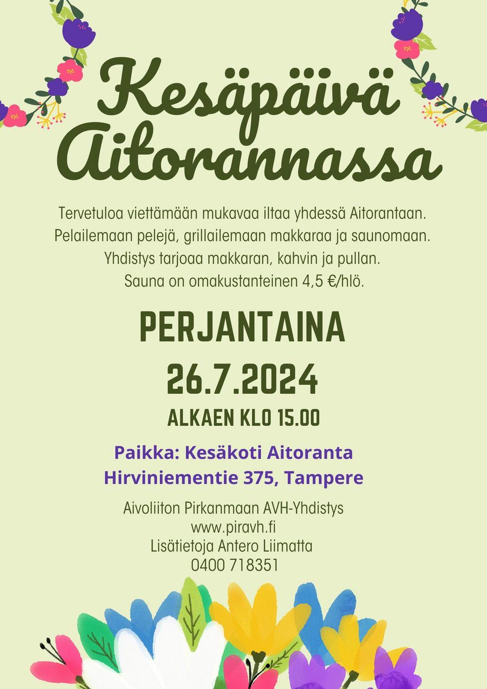 Tervetuloa viettämään rentoa iltapäivää ja iltaa kanssamme Aitorantaan 26.7.2024 klo 15 alkaen.