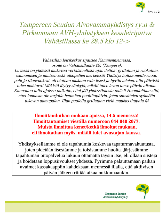 Tampereen Seudun Aivovammayhdistys ry:n & Pirkanmaan AVH-yhdistyksen kesäleiripäivä Vähäsillassa ke 28.5 klo 12->